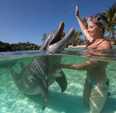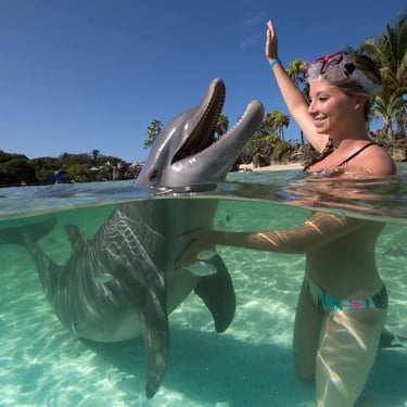 Swim with dolphins and enjoy an unforgettable family experience 🐬, followed by a tour visiting the Chocolate Factory, Rum & Rum Cake Factory, local craft market, and photo stops at the colorful Roatán sign.