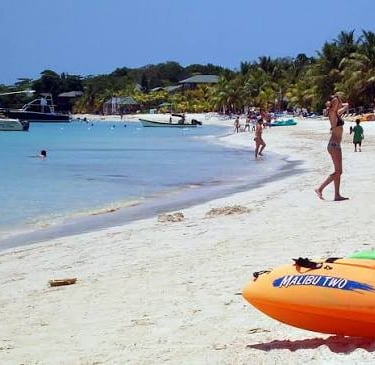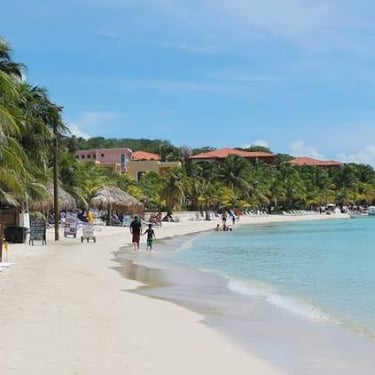 Enjoy crystal-clear waters, white sand, tropical drinks, and beach amenities, then visit the Chocolate Factory, Rum Cake Factory, local market, and stop at the Roatán sign for photos.